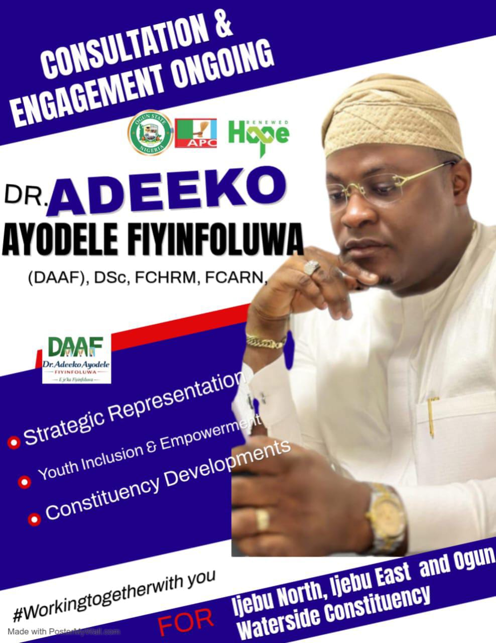 “A case in point is that of one Adeeko Ayodele Adeeko Ayodele Fiyinoluwa (DAAF) who claims to be a Senior Special Assistant (SSA) to the President on Youth Development. He is an aspirant seeking to represent Ijebu North/Ijebu East and Ogun Waterside Federal Constituency.
